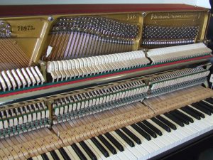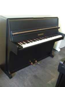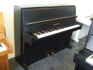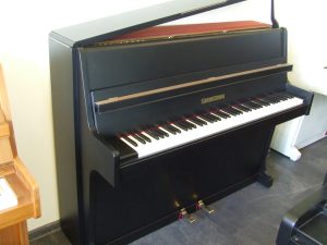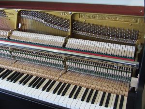 Pianino Grotrian Steinweg, rok budowy 1956/Braunschweig/Niemcy. Mechanizm w oryginale Steinweg'a po przeglądzie i regulacji, dla stabilności stroju wymienione zostały wszystkie kołki stroikowe, płyta rezonansowa jest wyszpanowana (ponownie naprężona), klawiatura odpowiednio zregenerowana stosunkowo ciężka, mebel całkowicie odnowiony po czym instrument wygląda bardzo ładnie. Wysokość 111 cm, szerokość 142 cm, głębokość 55 cm. Uwaga, dna rezonansowe we wszystkich naszych remontowanych instrumentach nie są wybielane. Osobiście stoję na stanowisku, że wybielanie niszczy płytę rezonansową odpowiedzialną za dźwięk.