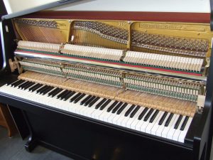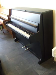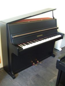 Pianino Grotrian Steinweg, rok budowy 1956/Braunschweig/Niemcy. Mechanizm w oryginale Steinweg'a po przeglądzie i regulacji, dla stabilności stroju wymienione zostały wszystkie kołki stroikowe, płyta rezonansowa jest wyszpanowana (ponownie naprężona), klawiatura odpowiednio zregenerowana stosunkowo ciężka, mebel całkowicie odnowiony po czym instrument wygląda bardzo ładnie. Wysokość 111 cm, szerokość 142 cm, głębokość 55 cm. Uwaga, dna rezonansowe we wszystkich naszych remontowanych instrumentach nie są wybielane. Osobiście stoję na stanowisku, że wybielanie niszczy płytę rezonansową odpowiedzialną za dźwięk.
