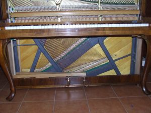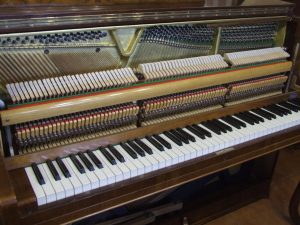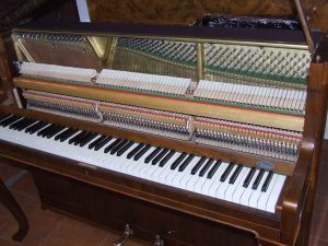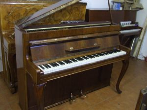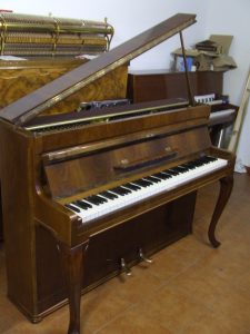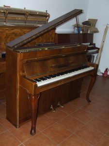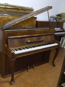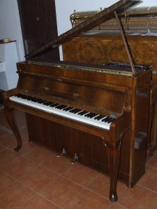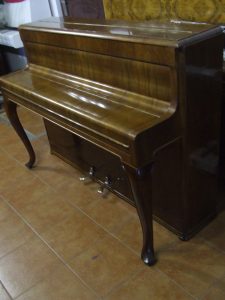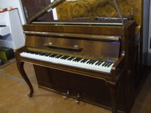 Pianino Weinbach, rok budowy 1953/Czechosłowacja. Mechanizm w oryginale po przeglądzie i regulacji, kołki stroikowe trzymają strój dobrze, klawiatura średniej ciężkości, mebel po drobnym liftingu wygląda całkiem przyzwoicie. Mimo swego zaawansowanego wieku instrument jest w pełni sprawny technicznie i bardzo ładnie gra. Wysokość 103 cm, szerokość 142 cm, głębokość 53 cm.